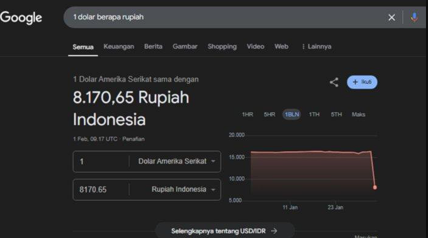 Pemuja.com – Mengejutkan, nilai tukar Rupiah tiba – tiba menguat luar biasa menjadi Rp 8.170,65 per Dolar AS pada Sabtu (1/2/2025). Namun, jangan terkecoh! Kondisi ini ternyata tidak benar-benar terjadi. Sebuah error di layanan informasi raksasa teknologi. Google, membuat kesalahan data yang mengejutkan.