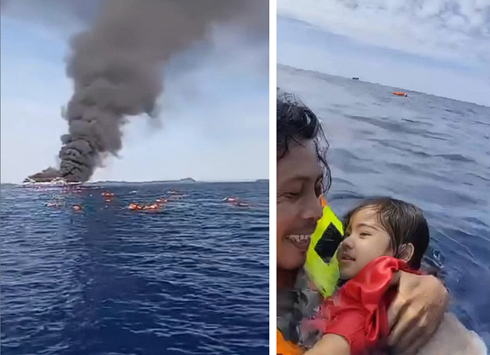 Kobaran api dengan cepat membesar, melahap sebagian besar badan kapal dan memaksa banyak penumpang melompat ke laut demi menyelamatkan diri.
