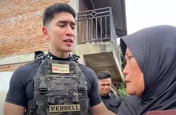 Anggota DPR dari Fraksi PAN, Verrell Bramasta, juga menuai perhatian ketika mengunjungi lokasi bencana dengan mengenakan rompi taktis berwarna gelap.