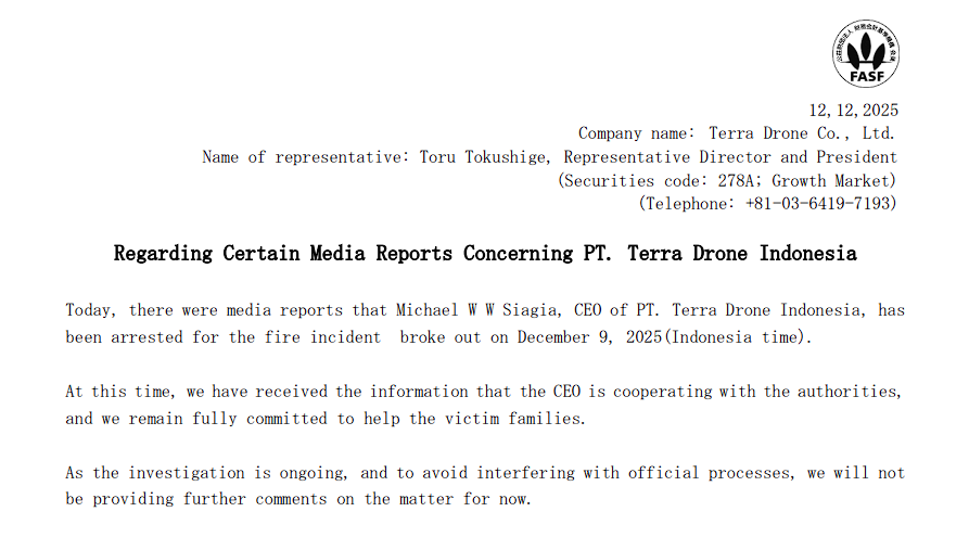 Terra Drone Corporation, induk Terra Drone Indonesia yang berkantor pusat di Jepang, merilis pernyataan resmi mengenai hal ini.