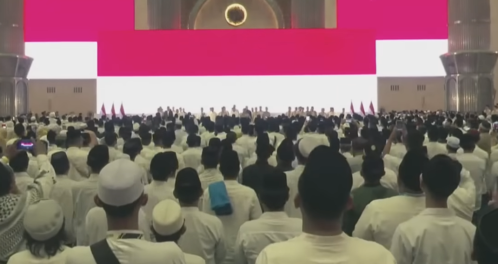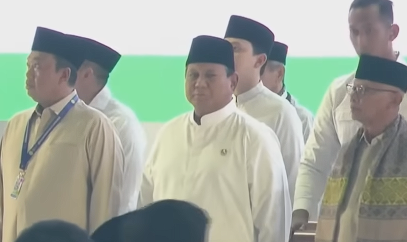 Prabowo hadir mengenakan baju koko putih dan peci hitam. Ia disambut hangat oleh para jamaah saat memasuki area utama Masjid Istiqlal.